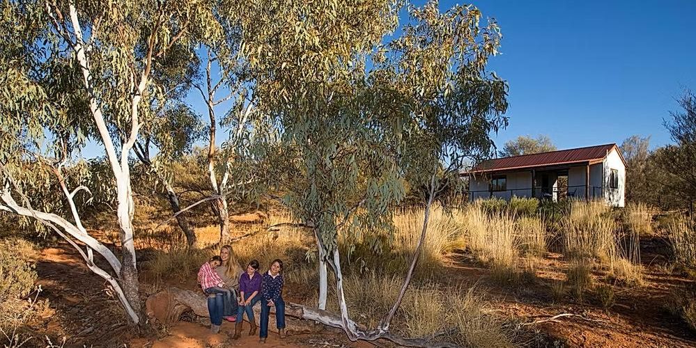 Located 30 kilometres south of Alice Springs, the 200-hectare outback property includes four private cabins, four glamping tents and a campground, alongside a restaurant, pool and natural billabong, set against the backdrop of the Ooraminna Hills.